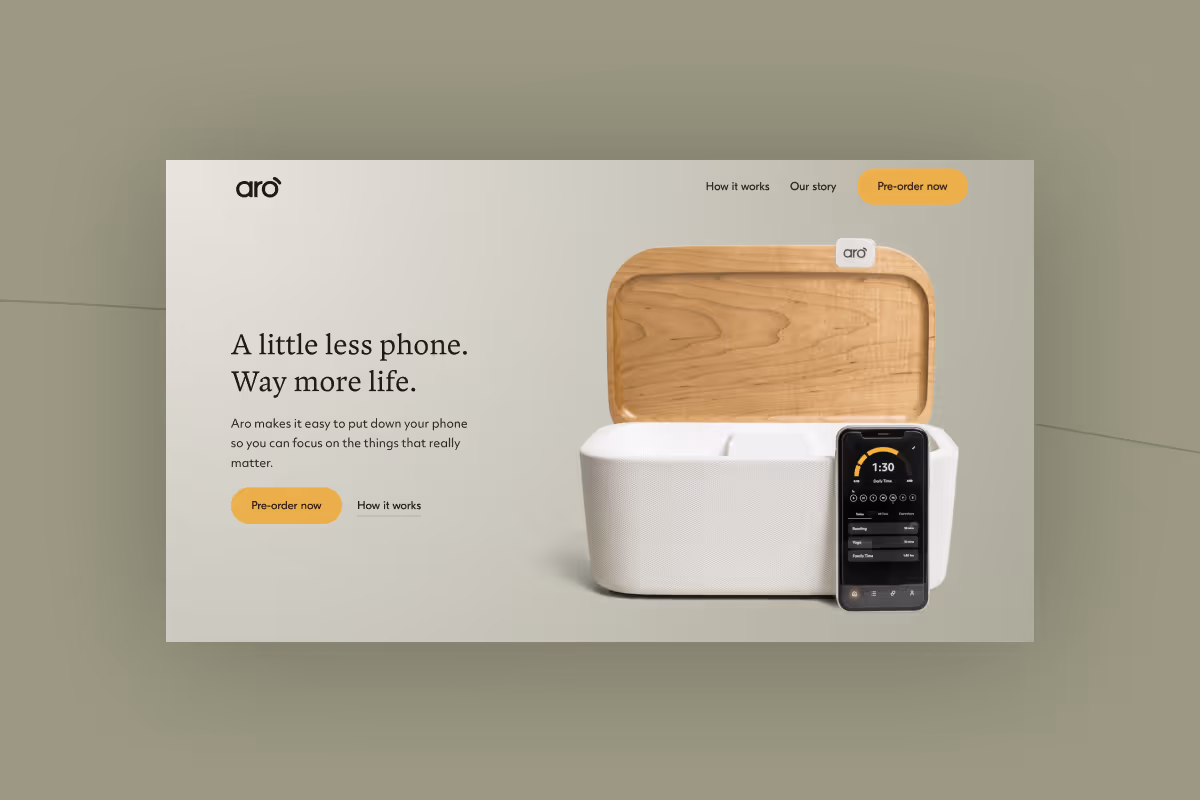 Smartphones are amazing, but really, really hard to put down. Aro makes that a little easier by giving your phone a smart box home and a companion app to track and celebrate the time you spend unplugged. Our team had the opportunity to name the brand, create the identity, design and build the digital experience (which won Site of the Day on Awwwards), and more. goaro.com