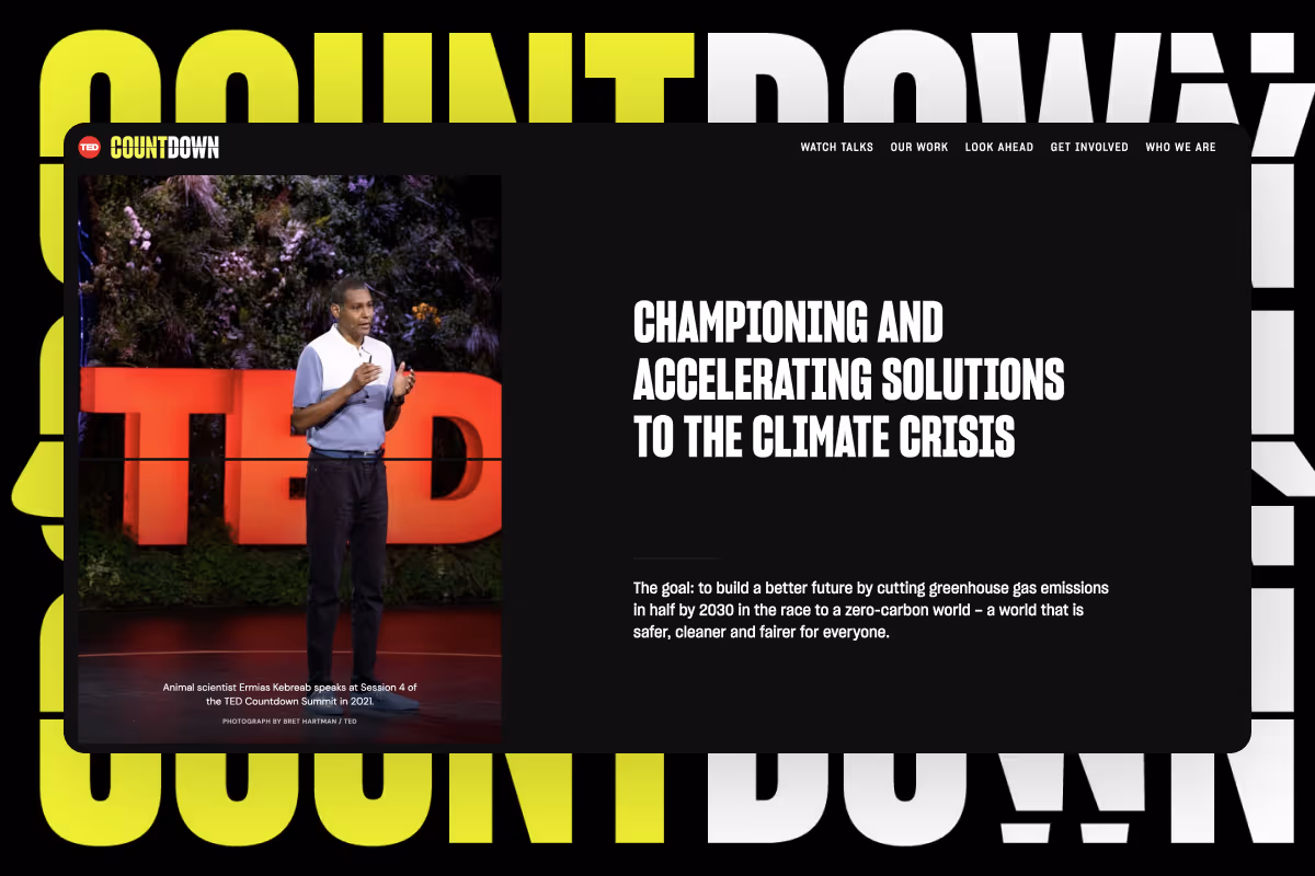 TED Countdown is exists to champion and accelerate solutions to the climate crisis. Our team is working with the TED team to reimagine this digital experience. countdown.ted.com