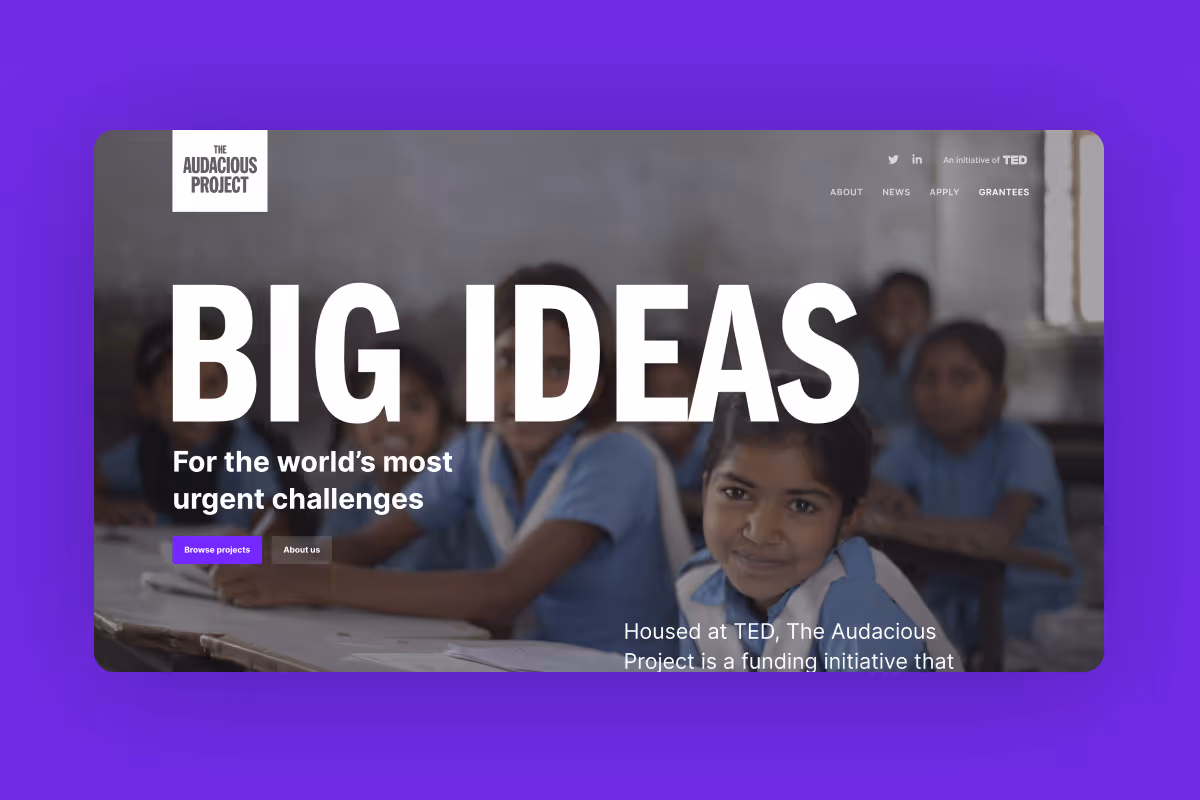 Housed at TED, The Audacious Project is a funding initiative that encourages the world’s greatest changemakers to dream bigger. They shape their ideas into viable multi-year plans and launch them to the world alongside visionary philanthropists. Whiteboard had the honor of design and developing The Audacious Project new website. audaciousproject.org