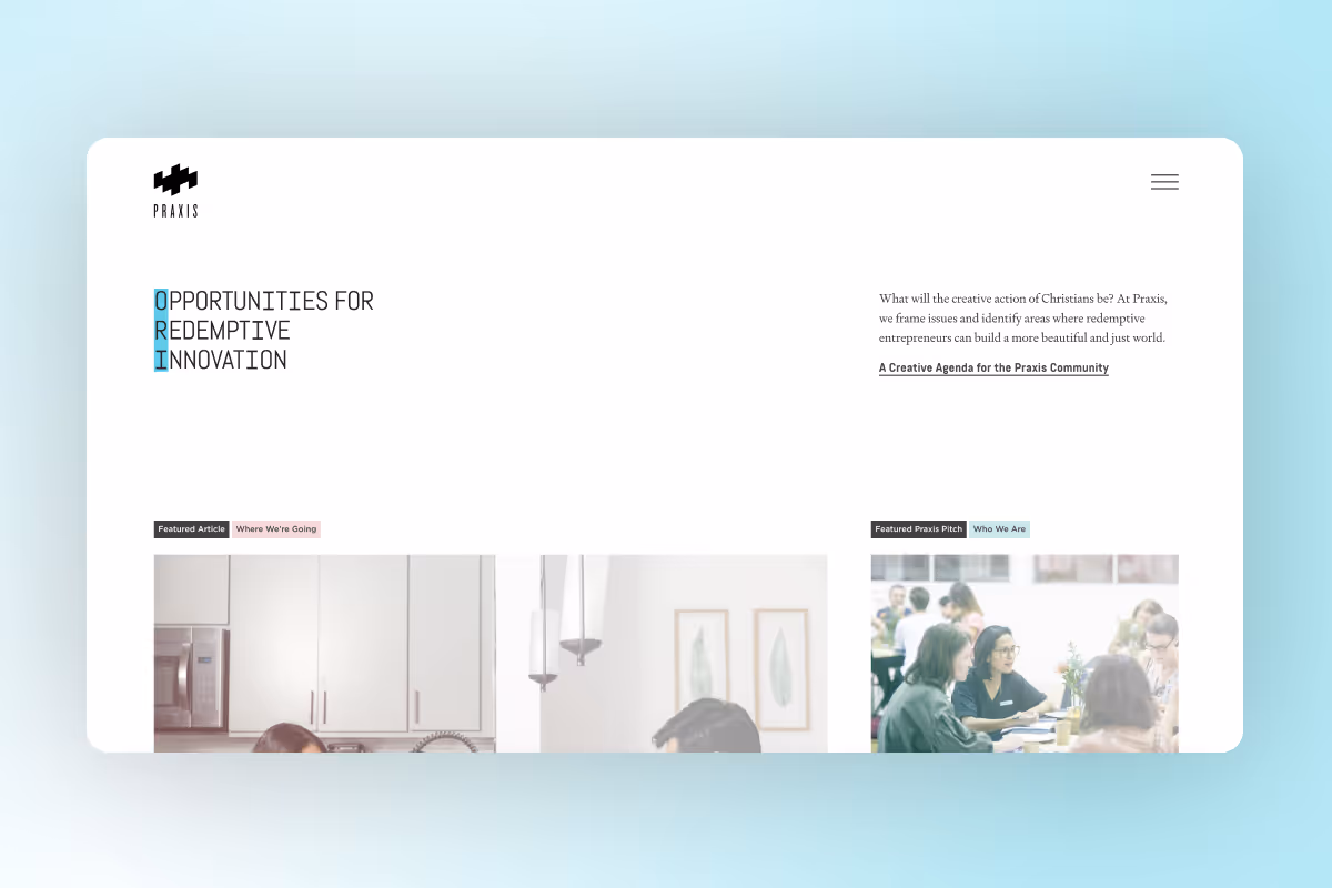 What will the creative action of Christians be? Praxis works to frame issues and identifies areas where redemptive entrepreneurs can build a more beautiful and just world. Our team had the opportunity to work alongside our friends at Praxis and Fivestone to bring this digital experience to life in time for Praxis's annual Redemptive Imagination Summit. We can't wait to see how this digital publication continues to evolve. praxislabs.org/ori