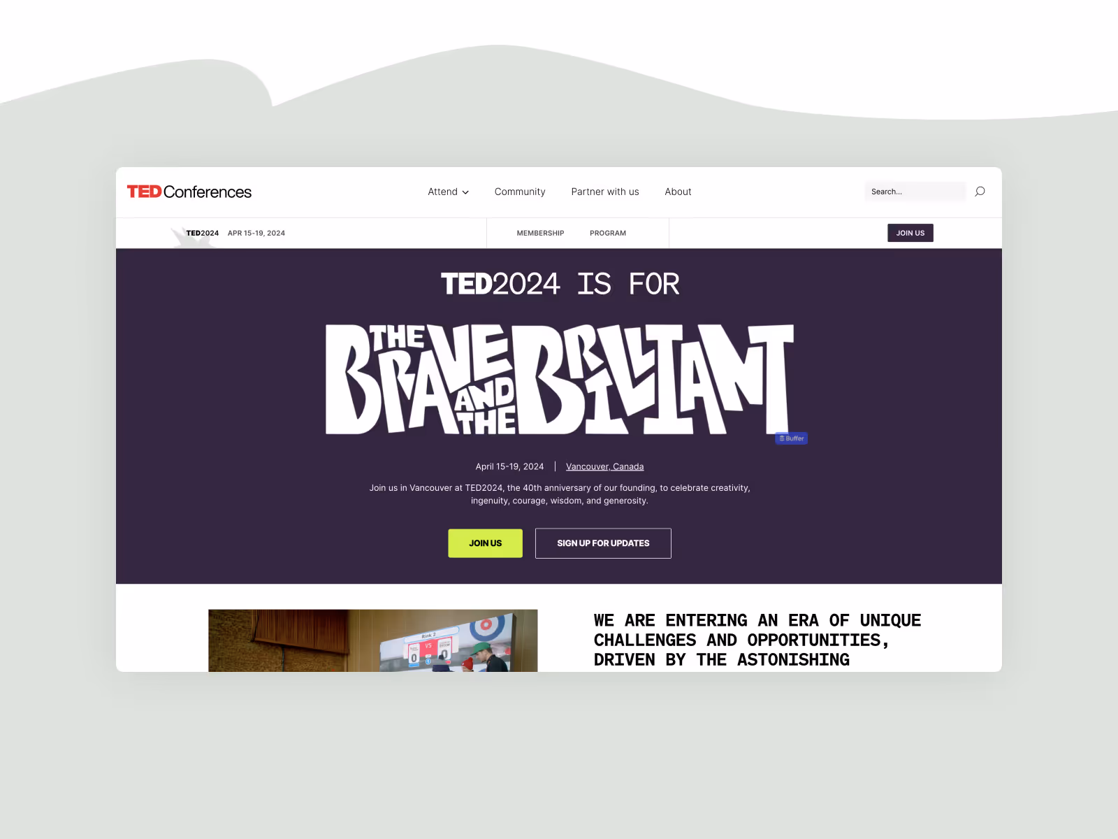 This event marks the 40th anniversary of TED's founding, to celebrate creativity, ingenuity, courage, wisdom, and generosity. We loved bringing this website to life with the TED team. Visit the website