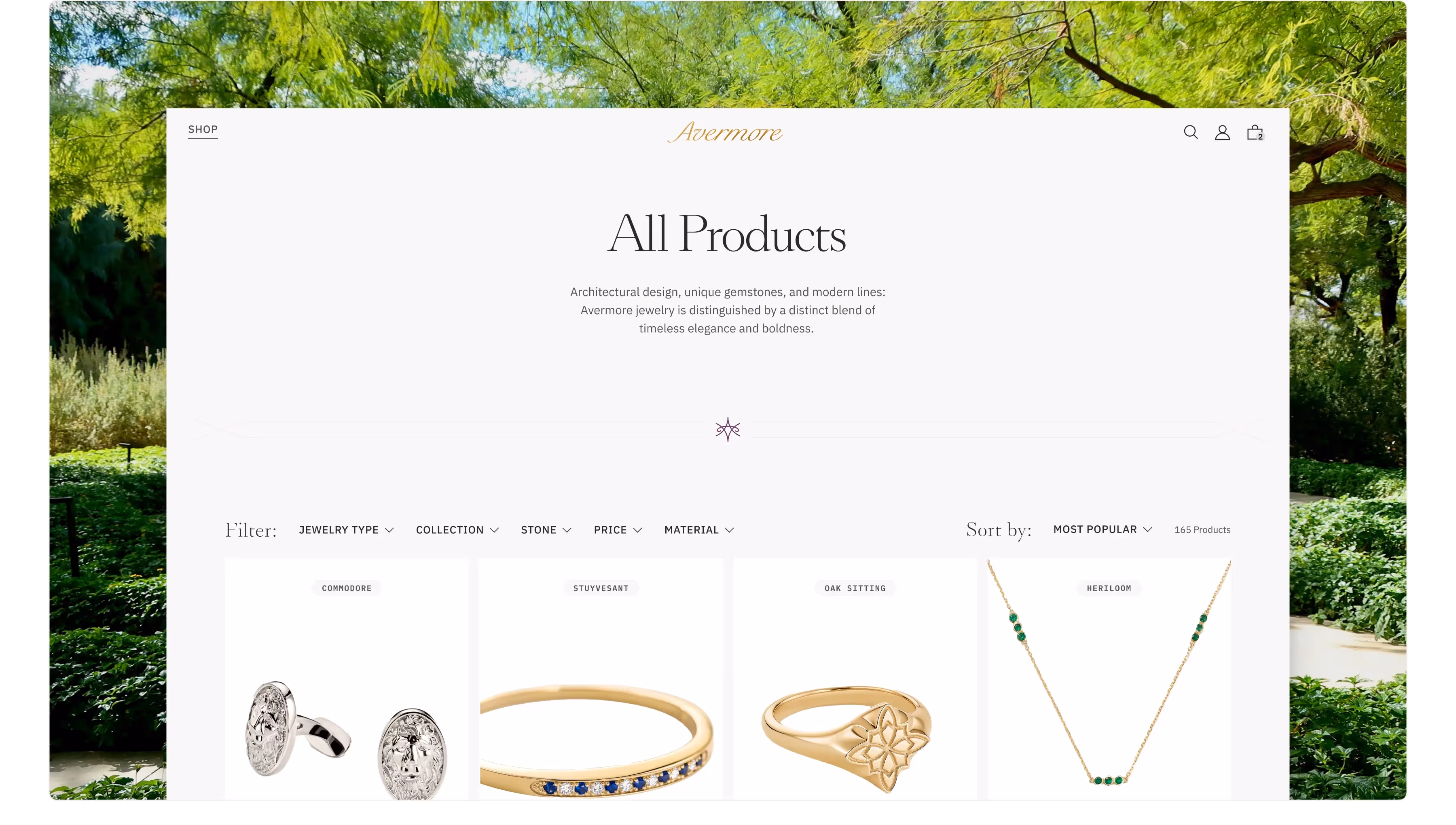 We partnered with Avermore to craft their heritage luxury brand for the modern era, translating founder Aubrey Vanderbilt Cecil's vision into a sophisticated digital presence. Working closely with her team, we clarified their brand essence—elegant, timeless, bold, yet approachable—through comprehensive discussions that refined Avermore's voice and strategic positioning in the luxury jewelry space. Our engagement began with strategic storytelling rooted in Biltmore's history and architecture, shaping the site structure with the same lens. The custom Shopify site we developed revolves around compelling collections, featuring advanced search capabilities, meticulous product detailing, and seamless e-commerce integration with accessibility best practices. The final website elegantly narrates a heritage story while speaking to the contemporary luxury market—a platform designed to scale and reflect the brand's evolving aspirations.