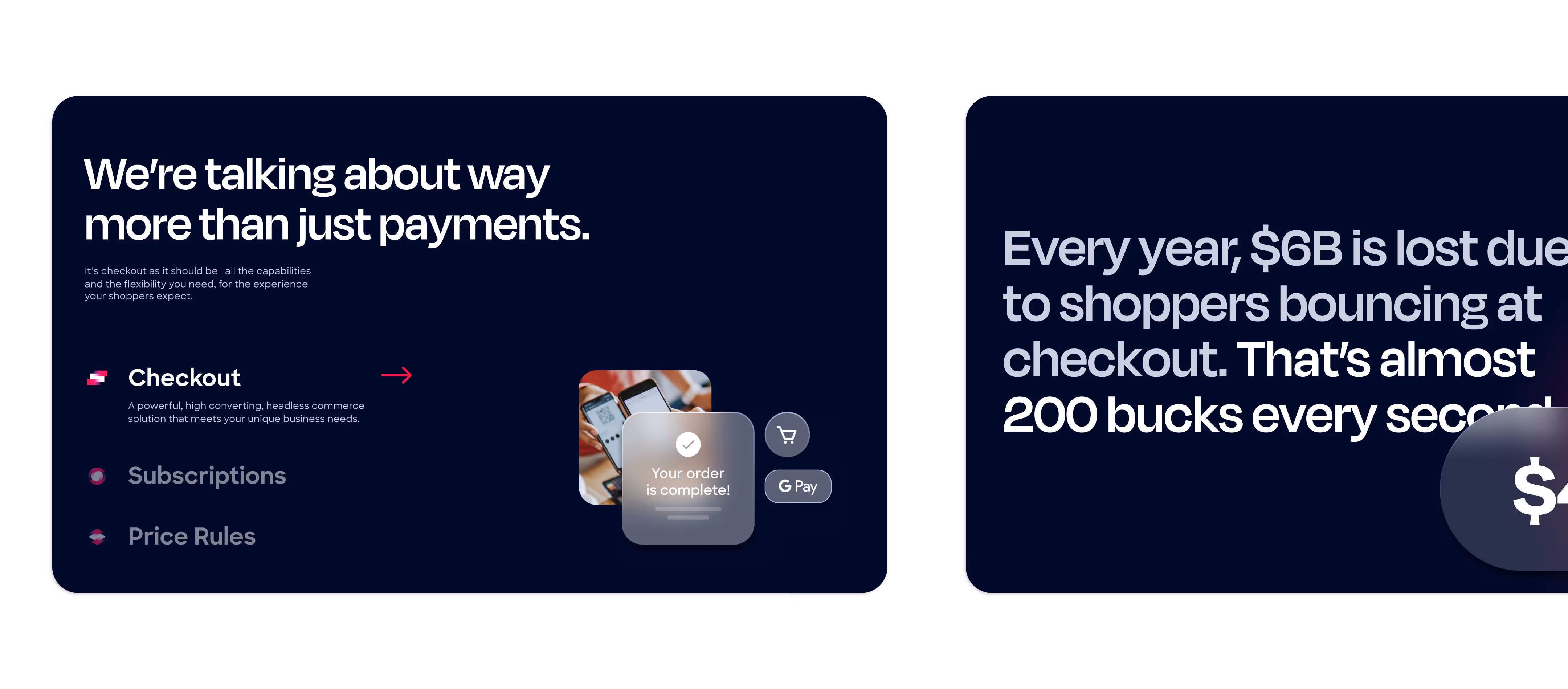 We partnered with Bold Commerce during their strategic pivot from Shopify Apps developer to headless checkout pioneer. Working closely with Matchstic following their comprehensive rebrand, we helped establish their new positioning as a checkout-first company while maintaining connections to their legacy audience. Our collaboration delivered a fresh digital brand system and marketing site that breaks conventional B2B tech conventions through bold typography, atmospheric gradients, and thoughtful user experience design. The result: a comprehensive web strategy that builds the case for headless checkout while creating "backdoors" for existing users. This partnership positioned Bold to confidently launch their new era focused on changing how the world's leading brands approach checkout forever.