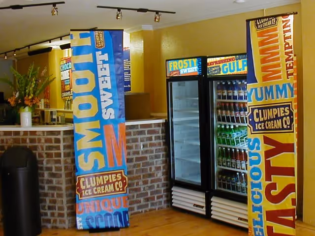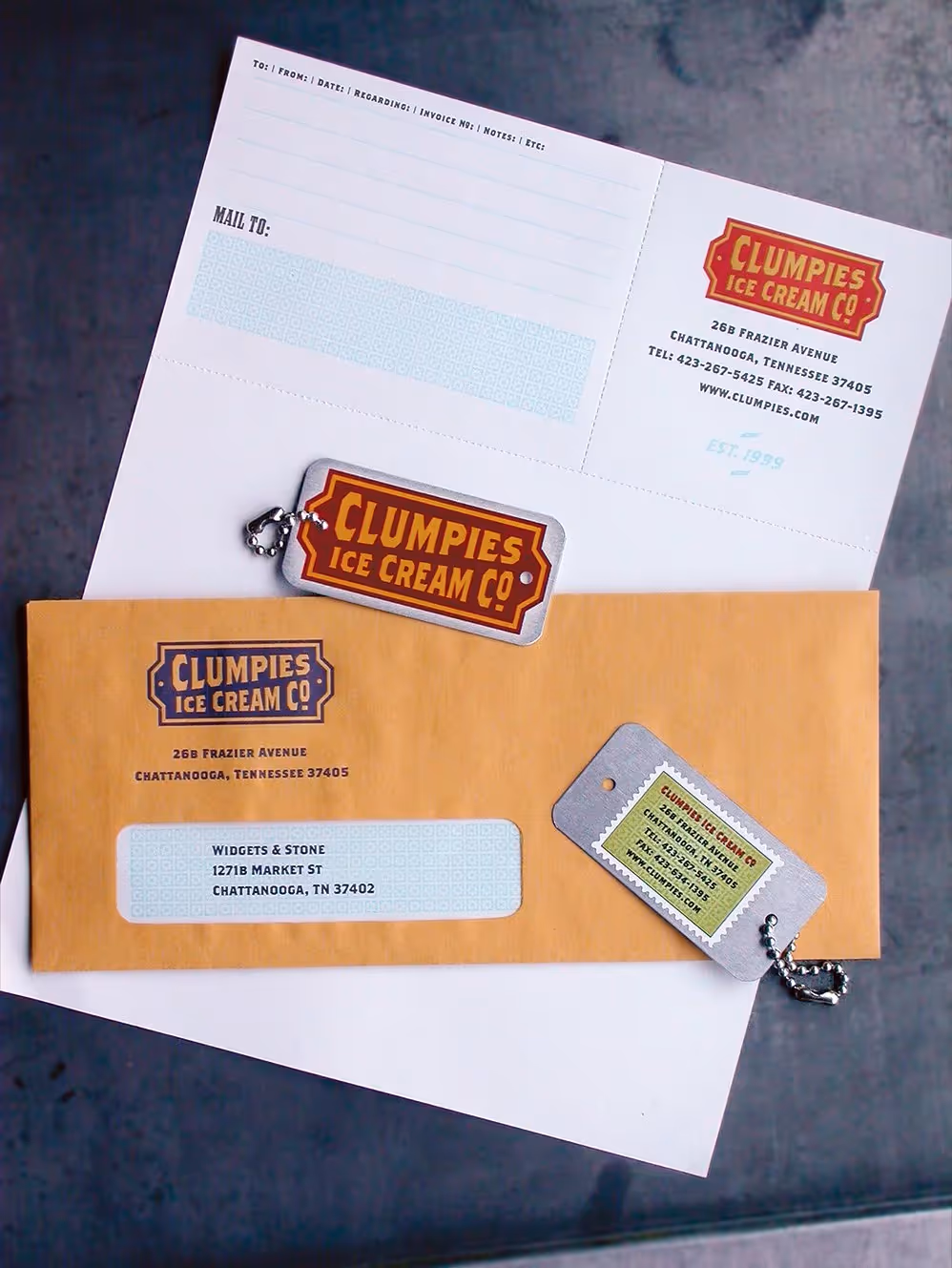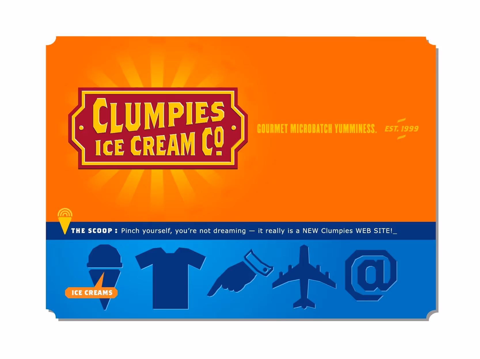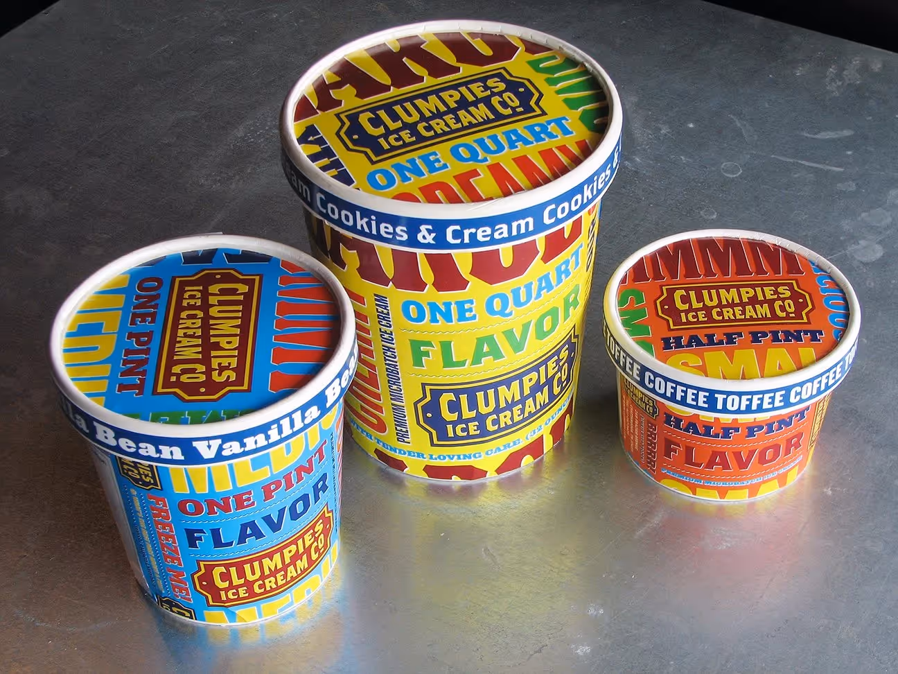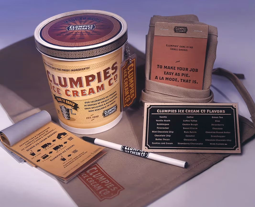 Marshall Brock came to Widgets & Stone with a vision to create a small batch ice cream shop focused on excellent craftsmanship and delightful flavors. His inspiration and guidance was to look to antique dairy farm equipment as we designed the logo and identity, so we did just that. Working closely with Marshall from 1999 to 2013, we built a brand identity that would prove its enduring value over the next quarter century.From 1999 to 2004, Clumpies' look and feel drew heavily on vintage farming catalogs, products and equipment. We utilized John Downer's Brothers and Council font designs from 1999, which were new variations on vintage typography from broadsides and tins that perfectly fit the antique theme. Our work included original stationery sets with letterpress printing and comprehensive sales kits that established the foundation for what would become a beloved local institution.As Clumpies expanded with joint ventures and new locations in 2004, we reimagined the brand style to move brighter, bolder and more playful. We introduced a type-heavy approach that utilized lighthearted writing and added brighter colors to the palette, creating new packaging designs and updated signage and wayfinding for the growing number of locations. In 2013, See Rock City acquired Clumpies Ice Cream Co., and the brand design duties were brought in-house. Even after all this time, the logo and visual identity are still going as strong as ever, a testament to thoughtful design that honors both craftsmanship and community connection.