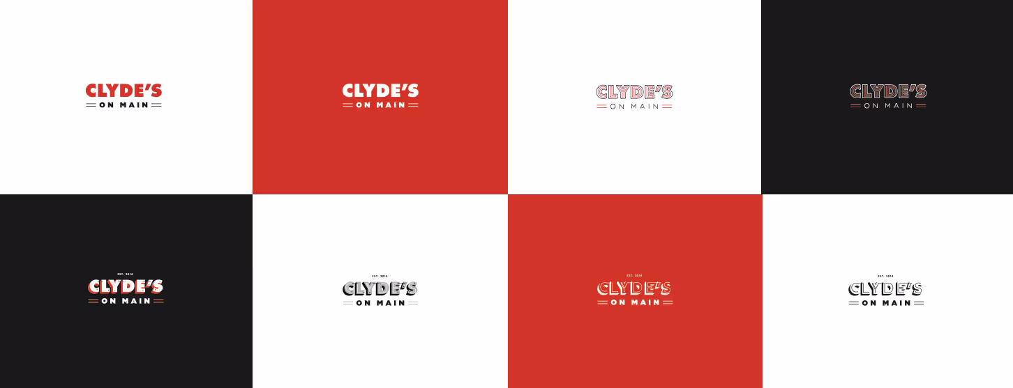 Experienced restaurateurs Mike & Taylor Monen and Tenley Mayfield approached Whiteboard to develop branding for their fifth restaurant concept, Clyde's On Main. The name honored the building's history as Clyde's Auto Glass, whose iconic painted wall sign was a beloved neighborhood landmark. Whiteboard embraced this local connection by basing the logo design on the original auto glass signage, creating an authentic link to the community's collective memory. Understanding that Clyde's was conceived as a "go-to" local spot with a deliberately undesigned, 1980s-inspired aesthetic, our design team created an intentionally flexible logo system. Rather than one rigid mark, we developed multiple logo variations that could adapt to any production method - flat bold art for painted signs, outlined lettering for rubber stamps, simplified forms for neon applications, and various other treatments. This approach resulted in an interchangeable family of logos with unified DNA but distinct personalities, perfectly matching the restaurant's eclectic, neighborhood-friendly character while providing practical versatility for real-world applications.