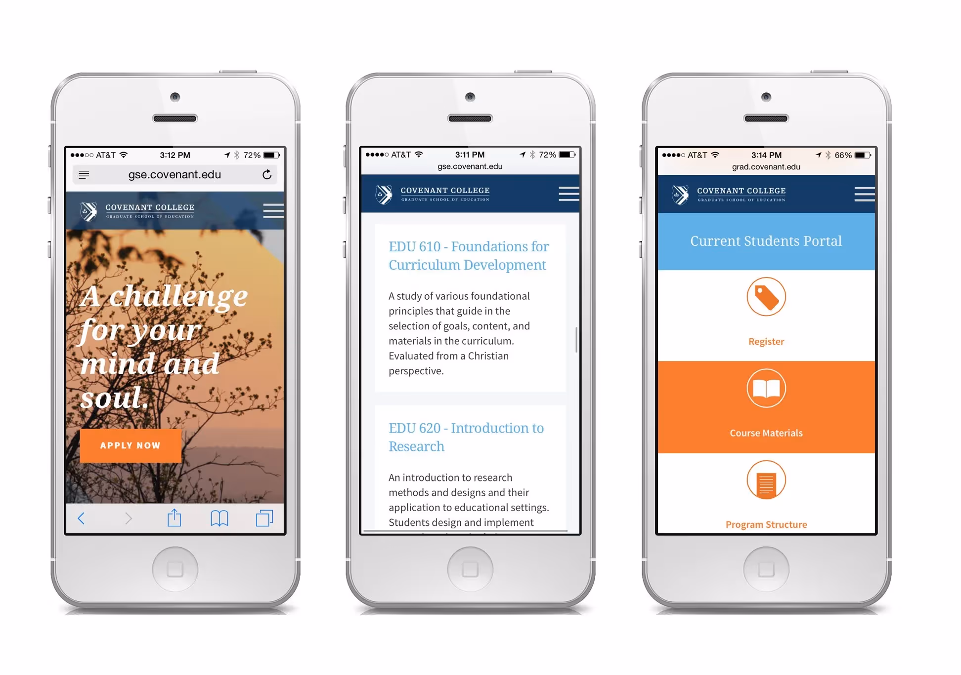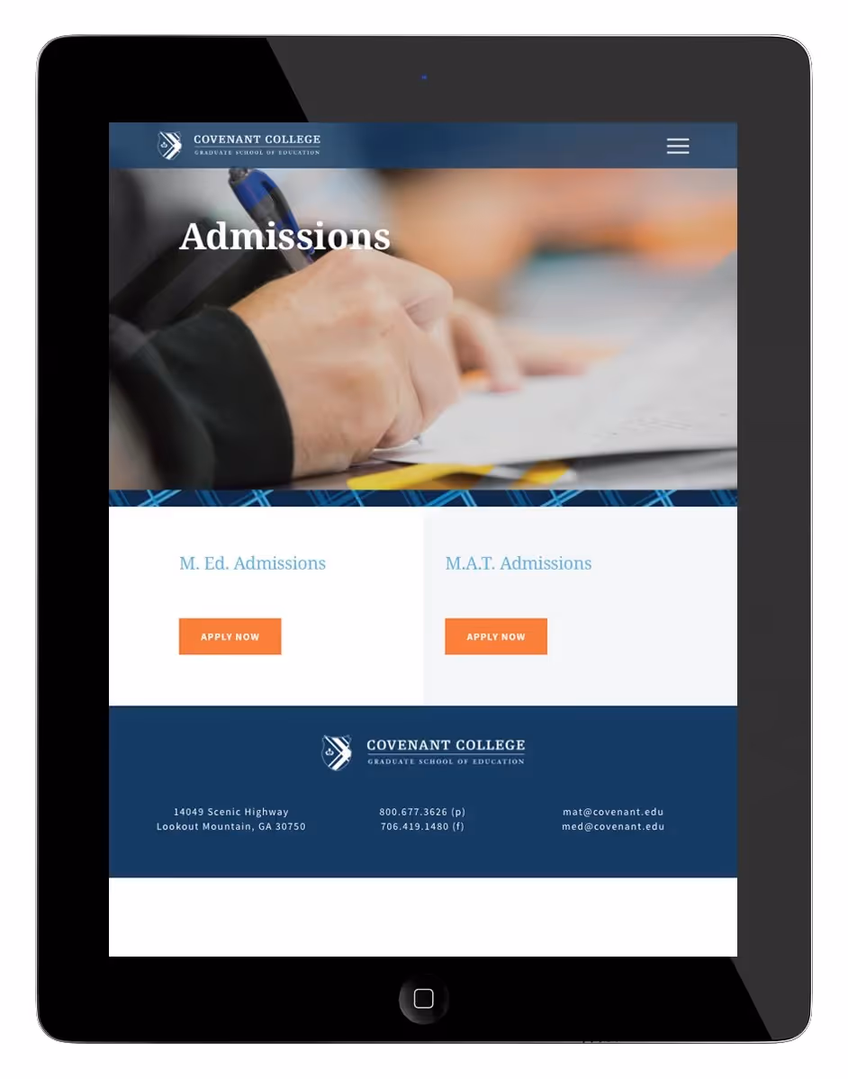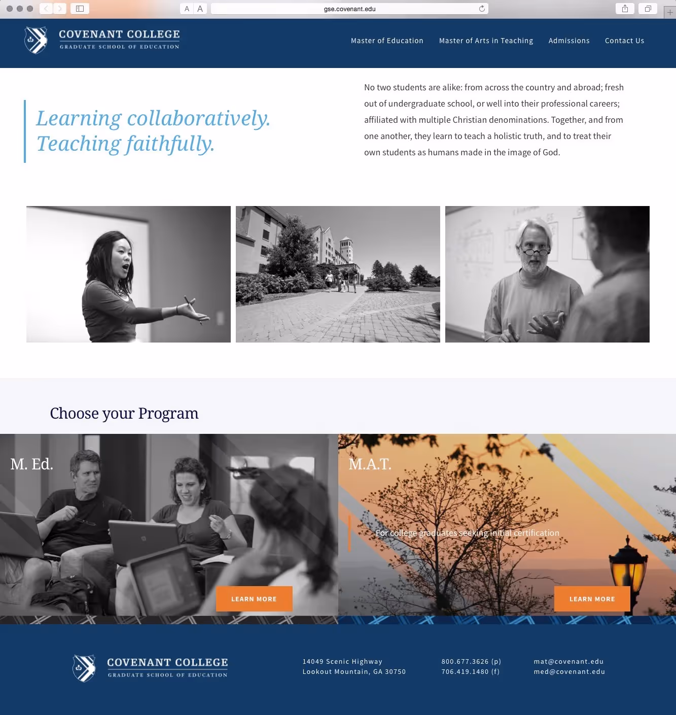 Covenant College's Graduate School of Education needed a digital platform that would build upon the institution's 2004 comprehensive identity while creating clear differentiation between undergraduate and graduate programs. The school required new messaging and web presence that honored their collaborative, faith-based approach to education. Whiteboard partnered with Widgets & Stone and 26 Tools in a strategic collaboration to develop both messaging and digital architecture for the program. Working with established design styles from the partner agencies, Whiteboard built a WordPress solution that the Covenant staff could easily manage while serving the specific needs of graduate education prospects. The flexible design functions seamlessly across devices while maintaining the clean, purposeful aesthetic that reflects the school's commitment to learning collaboratively and faithfully.