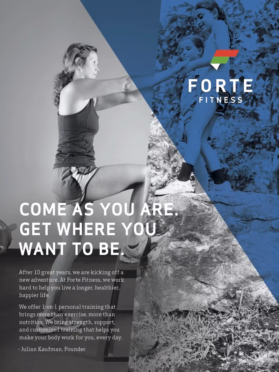 After a decade working for a national franchise, personal trainer Julian Kaufman decided to launch his own fitness studio. Having developed an excellent client base and reputation through years of one-on-one training, Julian partnered with Whiteboard to create an identity reflecting that excellence in his brand communications. Whiteboard collaborated with Caleb Ludwick and Grant Dotson to develop the complete Forte Fitness brand including naming, writing, design, and photography. The name and visual identity drew inspiration from Julian's Italian heritage - Forte means 'strong' in Italian while remaining familiar to English speakers. The Italian flag's colors influenced the logo design, with the azzurri blue of Italy's national teams playing a complementary role in the palette. The black and white photography showcases how training and lifestyle integrate at Forte Fitness, creating distinctive marketplace presence.