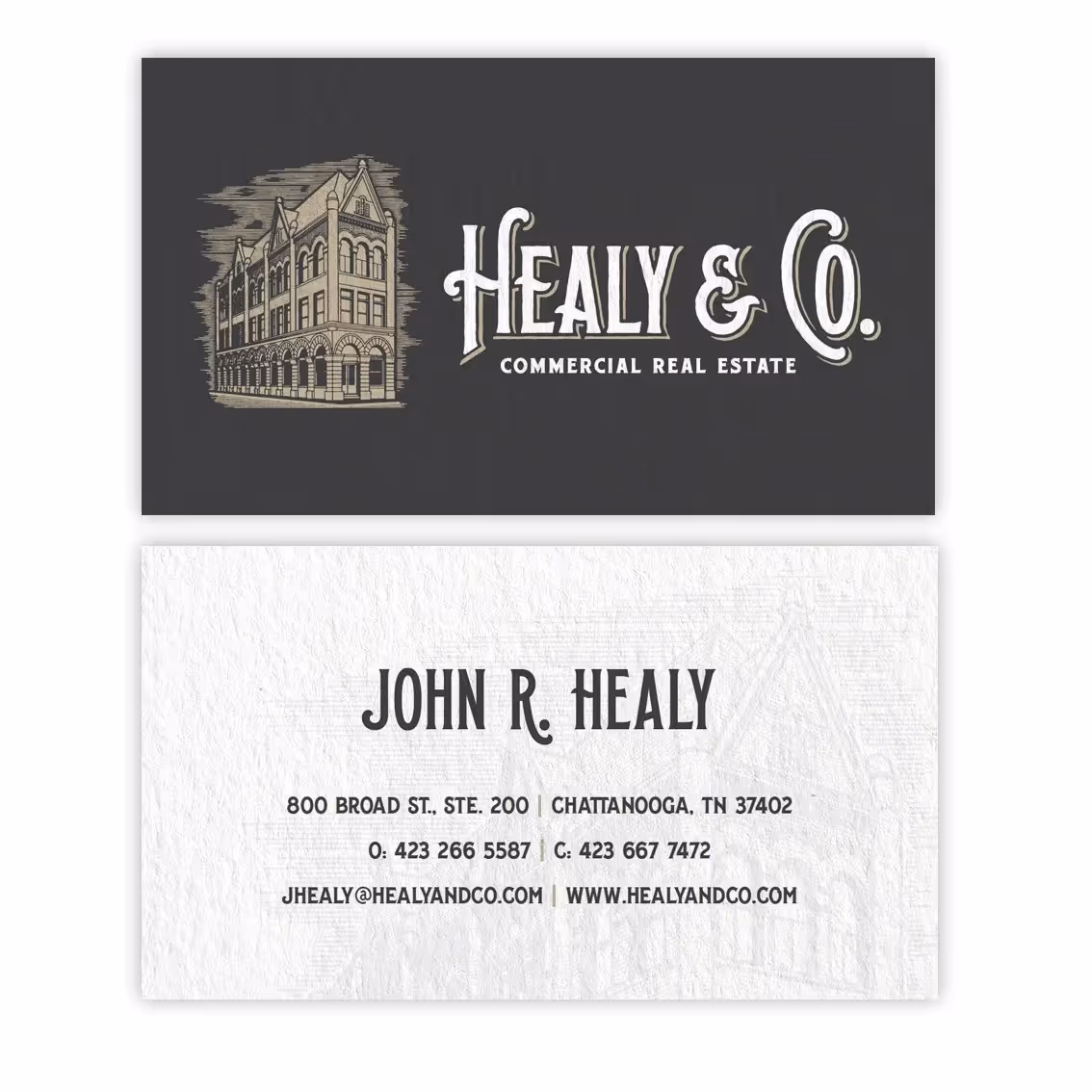 Following Whiteboard's successful redesign of the Healy & Co website in early 2018, owner John Healy sought a new logo that would distance the company from its previous SVN association while establishing a distinct identity rooted in heritage and history. The challenge was creating a mark that would stand out in the competitive landscape of contemporary real estate branding, where most logos follow predictable modern conventions. Our approach centered on celebrating the company's established presence through authentic architectural details and craftsmanship-inspired typography. Designer Travis Hitchcock developed a unique vintage line rendering of the company's actual office building, pairing it with a carefully customized version of the LHF Whistler typeface. This combination created a distinctive identity that communicates stability, local expertise, and authentic connection to place - values that resonate strongly in real estate where trust and community knowledge are paramount. The resulting logo system provides Healy & Co with a memorable brand presence that honors their history while confidently competing in today's market.