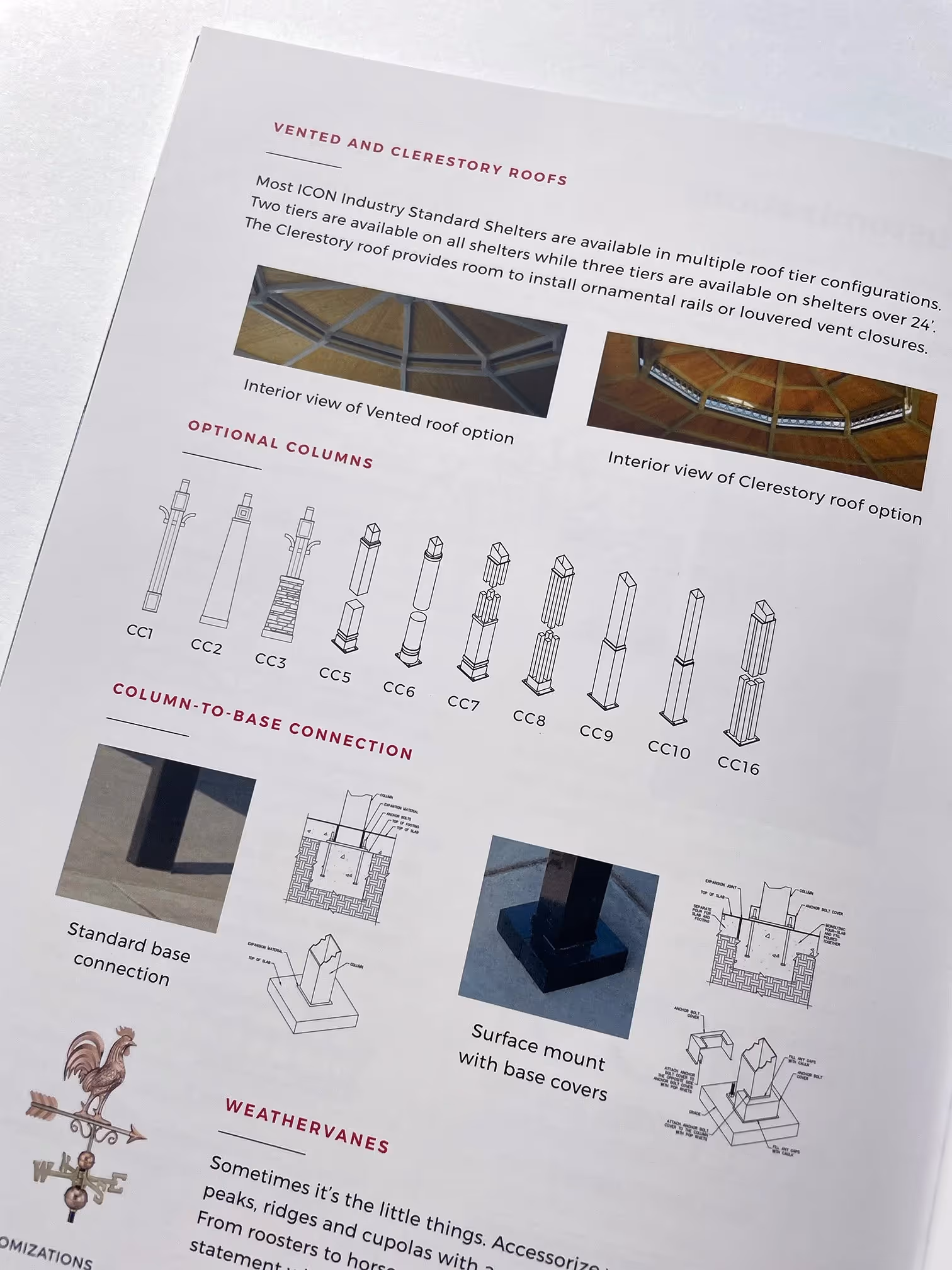Whiteboard partnered with ICON Structures to create a catalog that reflects the same meticulous care and attention to detail that defines their architectural and fine art structures. ICON Structures approaches design with the precision and aesthetic consideration typically reserved for high-end architectural projects, requiring marketing materials that communicate this elevated standard. Our catalog design strategy emphasizes bold, colorful photography paired with vibrant red typography that creates a dynamic visual hierarchy throughout the publication. The design leads readers through a carefully orchestrated narrative that showcases featured products while providing comprehensive style guides and technical information. Through strategic use of color, typography, and layout principles, the catalog communicates ICON Structures' commitment to excellence while making complex structural information accessible and engaging. The bold visual approach ensures the catalog stands out in a competitive market while reinforcing the company's position as a premium provider of architectural-quality structural solutions.