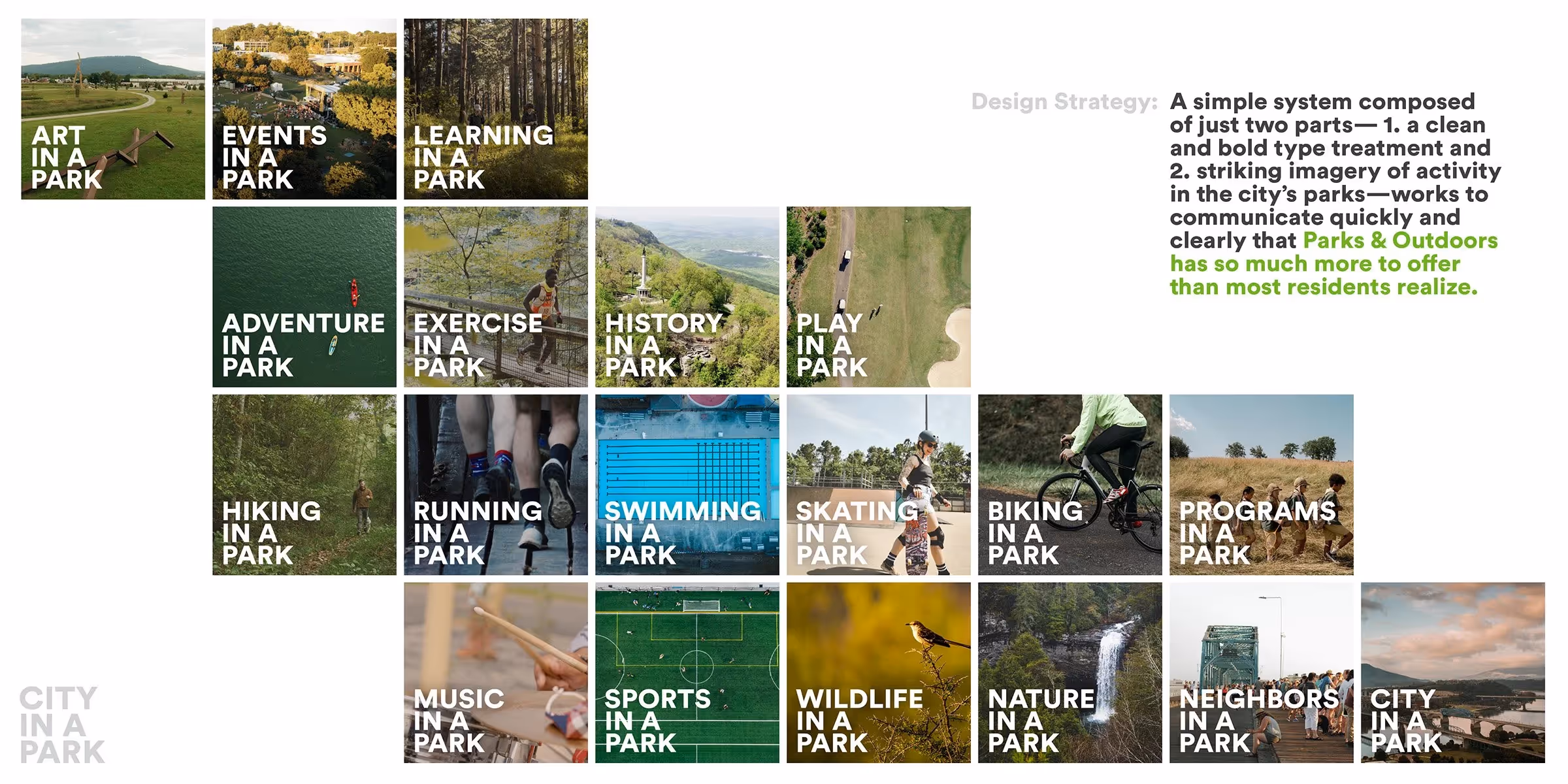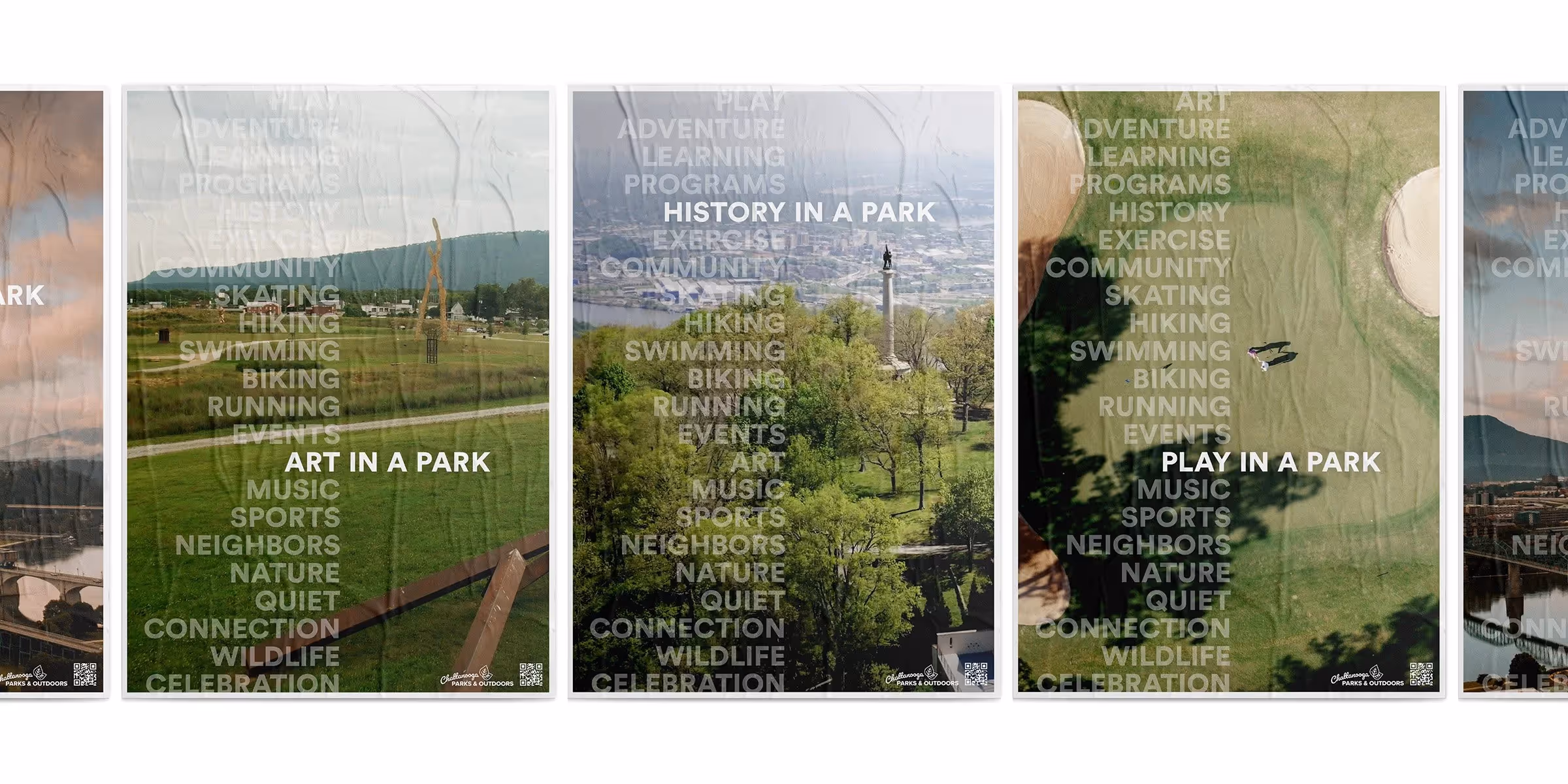 When Chattanooga Parks & Outdoors needed to promote the city's remarkable integration of built and natural spaces, they approached Whiteboard to create a visibility initiative that would showcase their unique positioning. The challenge was communicating Chattanooga's extraordinary access to beautiful parks and outdoor resources while stimulating public engagement with these offerings. “City in a Park” became the central theme – capturing how Chattanooga boasts unrivaled accessibility to some of Tennessee's most beautiful parks and exciting outdoor resources. Working closely with consultants and the Parks & Outdoors Department, designer Mark Walter developed a dynamic and flexible design system that could adapt across multiple touchpoints. The campaign highlighted the impressive educational, recreational, and cultural resources available to Chattanoogans while celebrating the staggering volume of beautiful natural spaces integrated throughout the city. The visual system successfully communicated this unique urban-natural harmony that makes Chattanooga truly a city in a park.
