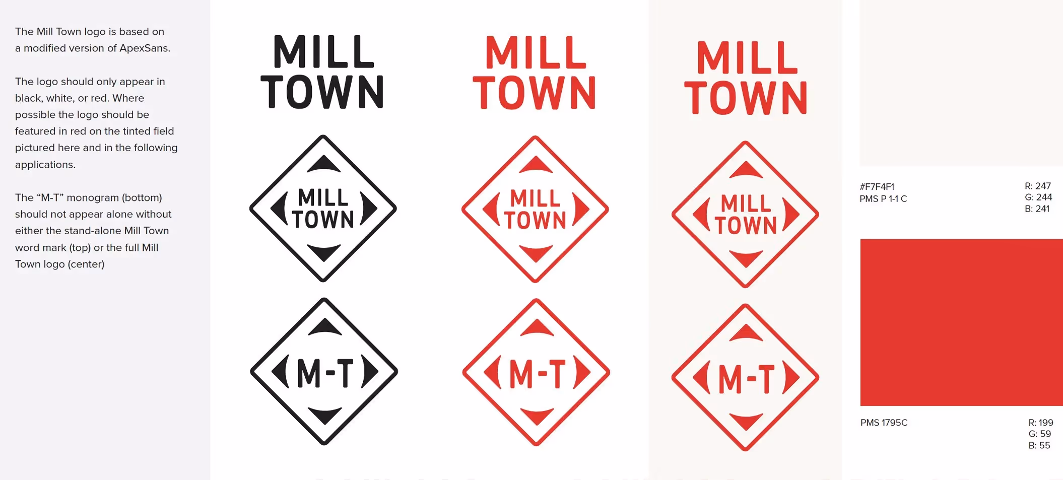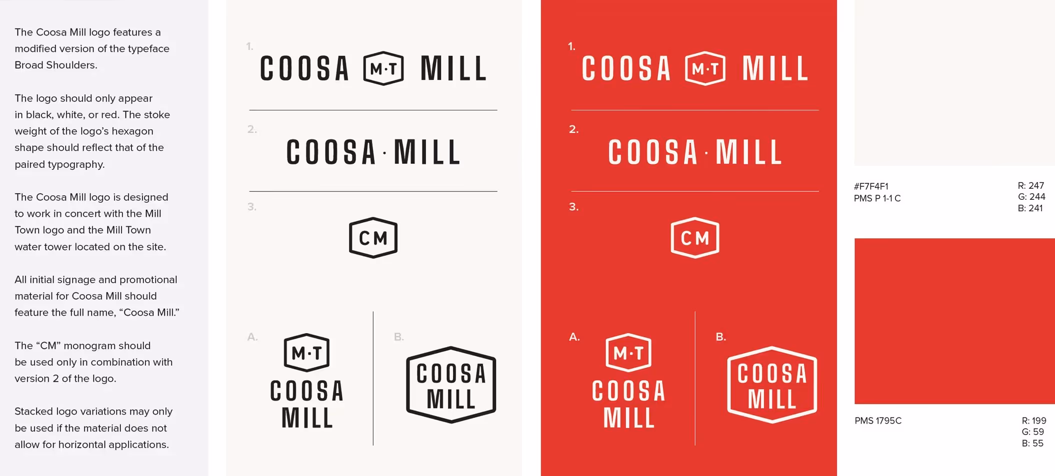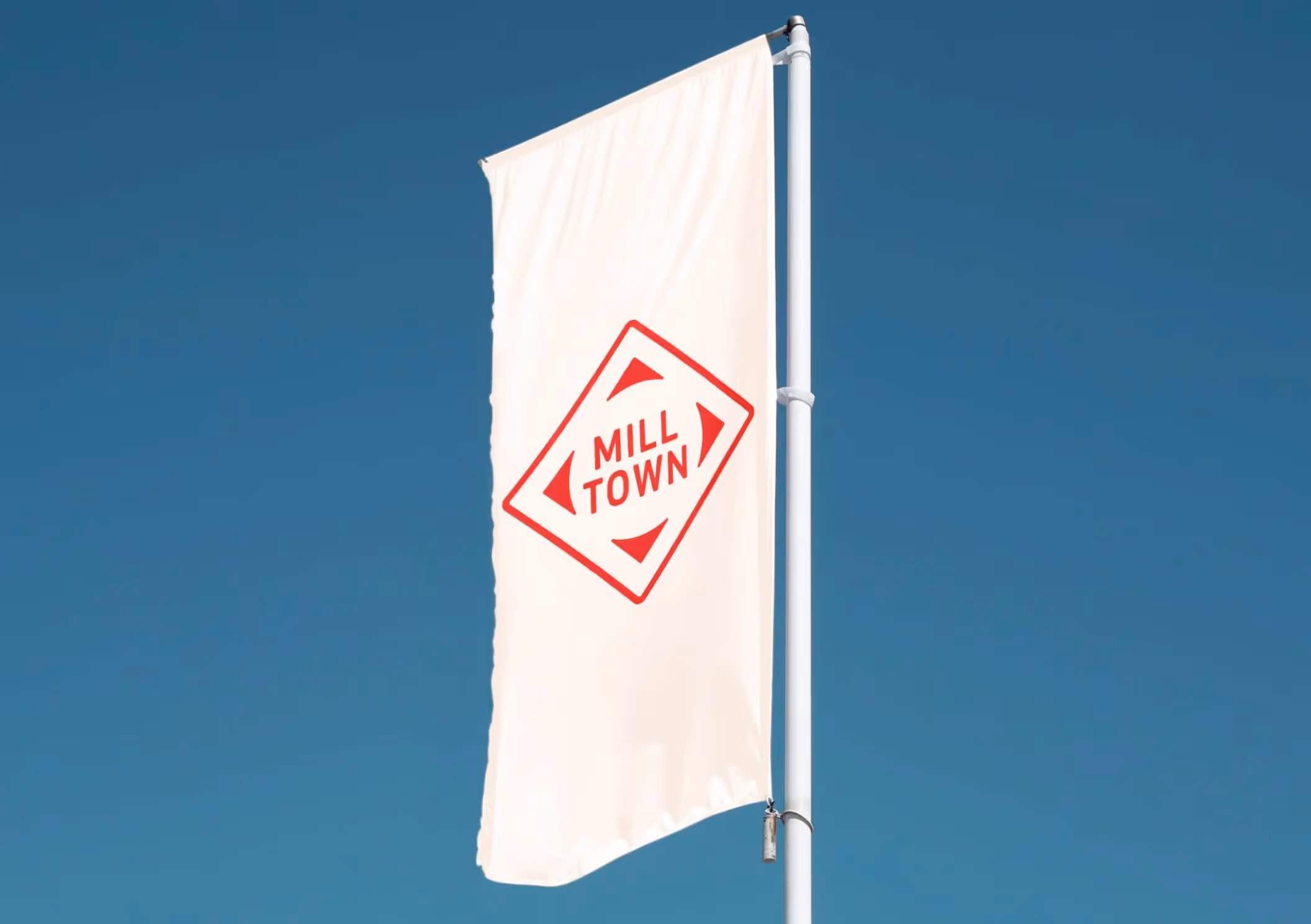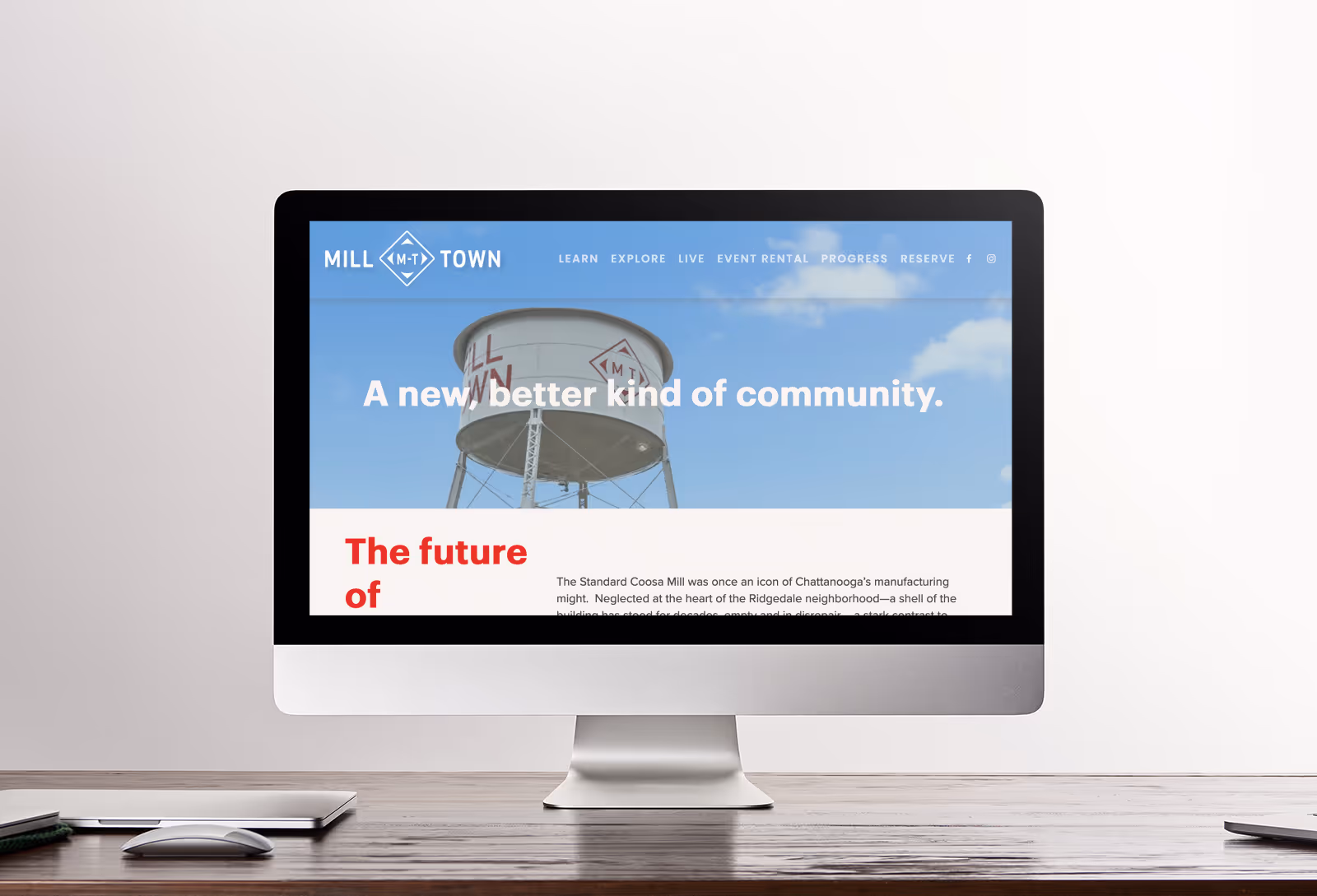 The Standard Coosa Mill once stood as an icon of Chattanooga's manufacturing might. For decades, the neglected structure at the heart of the Ridgedale neighborhood served as a stark reminder of industrial decline—a sharp contrast to the celebrated city center just two miles northeast. When Benwood, Chattanooga Neighborhood Enterprise, and Collier Construction formed a partnership to revitalize this abandoned 20-acre parcel, Whiteboard partnered with them to create an identity worthy of this transformative vision. The challenge was developing names and branding for both the overall mixed-use development and the restored factory building that would honor the site's industrial heritage while embodying its sustainable future. Our approach drew inspiration directly from the location's history and architecture. The diamond shape of the defunct Standard Coosa Thatcher Mill provided the foundation for the Mill Town mark, while bright, bold colors and typography were selected to stand out in the environment. For the anchor structure, we created the Coosa Mill identity, with the refurbished water tower inspiring the abstracted geometric enclosure that mirrors the Mill Town logo's geometry.