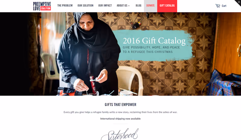 Preemptive Love Coalition approached Whiteboard during a season of rapid growth, seeking a partner with a growth hacker mindset who could apply data-driven strategies to donor development. Our team began with comprehensive stakeholder interviews spanning from the Director of Operations to development officers, designers, and senior field reporters. We analyzed CRM data, web analytics, and their existing platform to determine optimal next steps. Whiteboard moved their subscriber data into MailChimp and designed a six-email automated workflow to nurture new subscribers into first-time donors over three weeks. We built PLC's first online Christmas Catalog as a custom Shopify theme, complete with donation functionality, abandoned cart messaging, and ecommerce tracking. As events in Aleppo escalated, we pivoted to launch Facebook campaigns amplifying their refugee relief efforts. Our approach consistently asked: What requires the least investment for greatest return? How can we balance long-term and short-term needs? This methodology delivered early wins while building scalable systems.