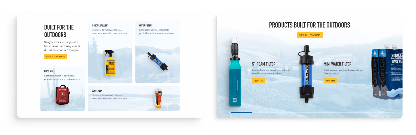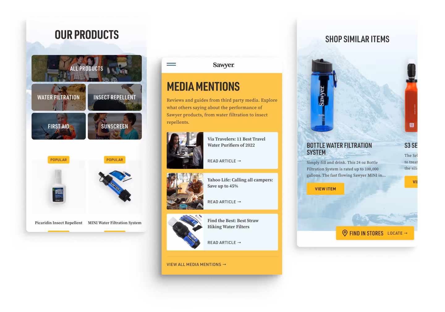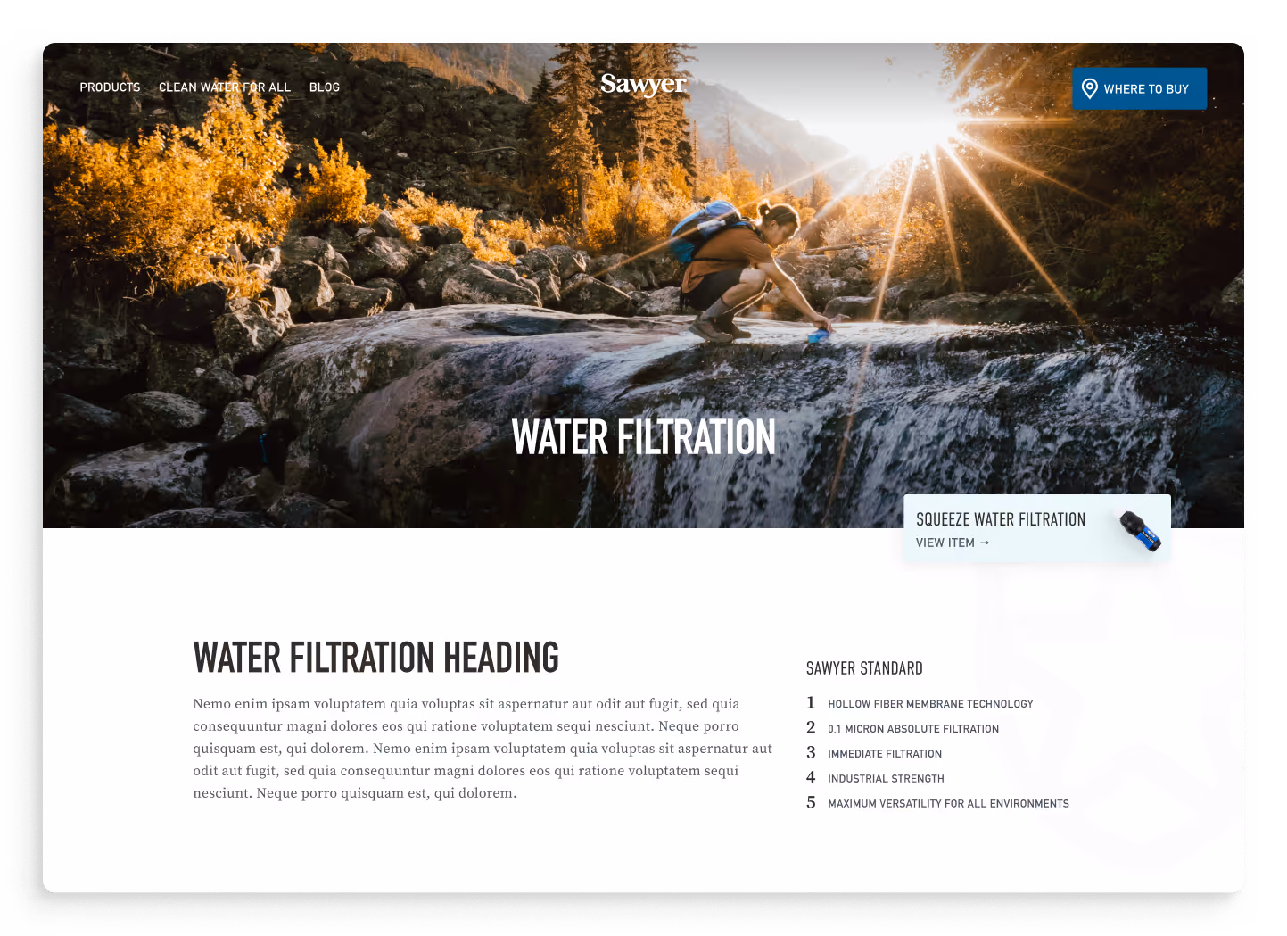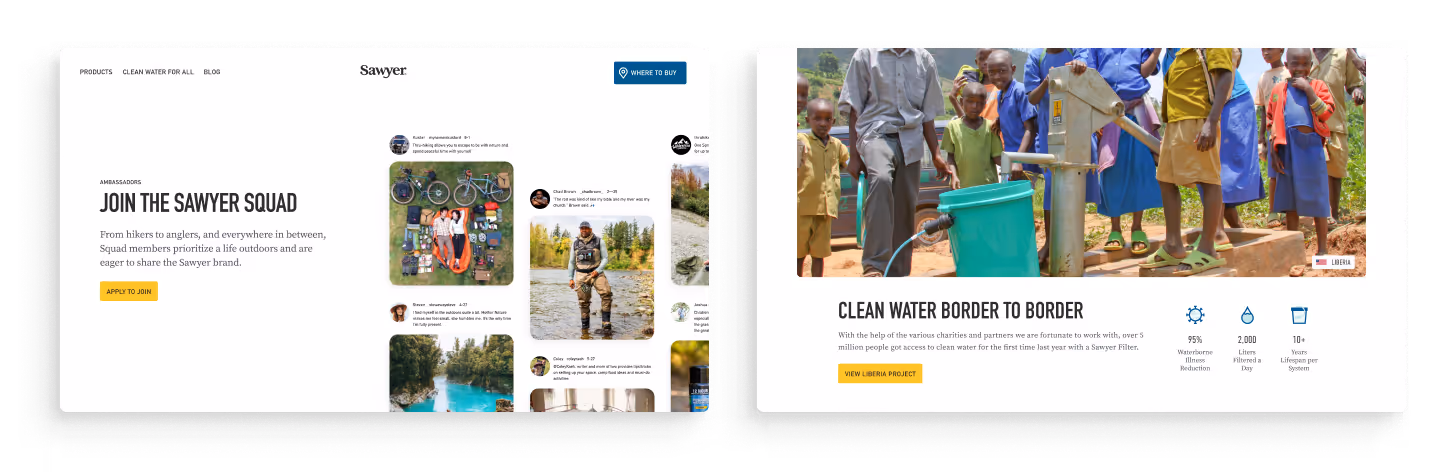 We partnered with Sawyer Products to strengthen their web presence by combining their international impact website and product-driven site into one cohesive experience that reflects both their quality products and global humanitarian impact. Working closely with This is Worthwhile during their rebranding and packaging redesign, we created a unique digital strategy that seamlessly balances promoting their trusted outdoor products with elevating their philanthropic work providing clean water solutions worldwide. Our collaboration resulted in a comprehensive website that empowers their team to edit products, share impact updates, and rely on a strong brand narrative supported by an efficient CMS structure. Through strategic positioning that honors both their established product expertise and expanding humanitarian mission, we helped Sawyer create a digital presence worthy of their 40-year legacy while supporting their continued growth in both commercial and impact-driven markets.