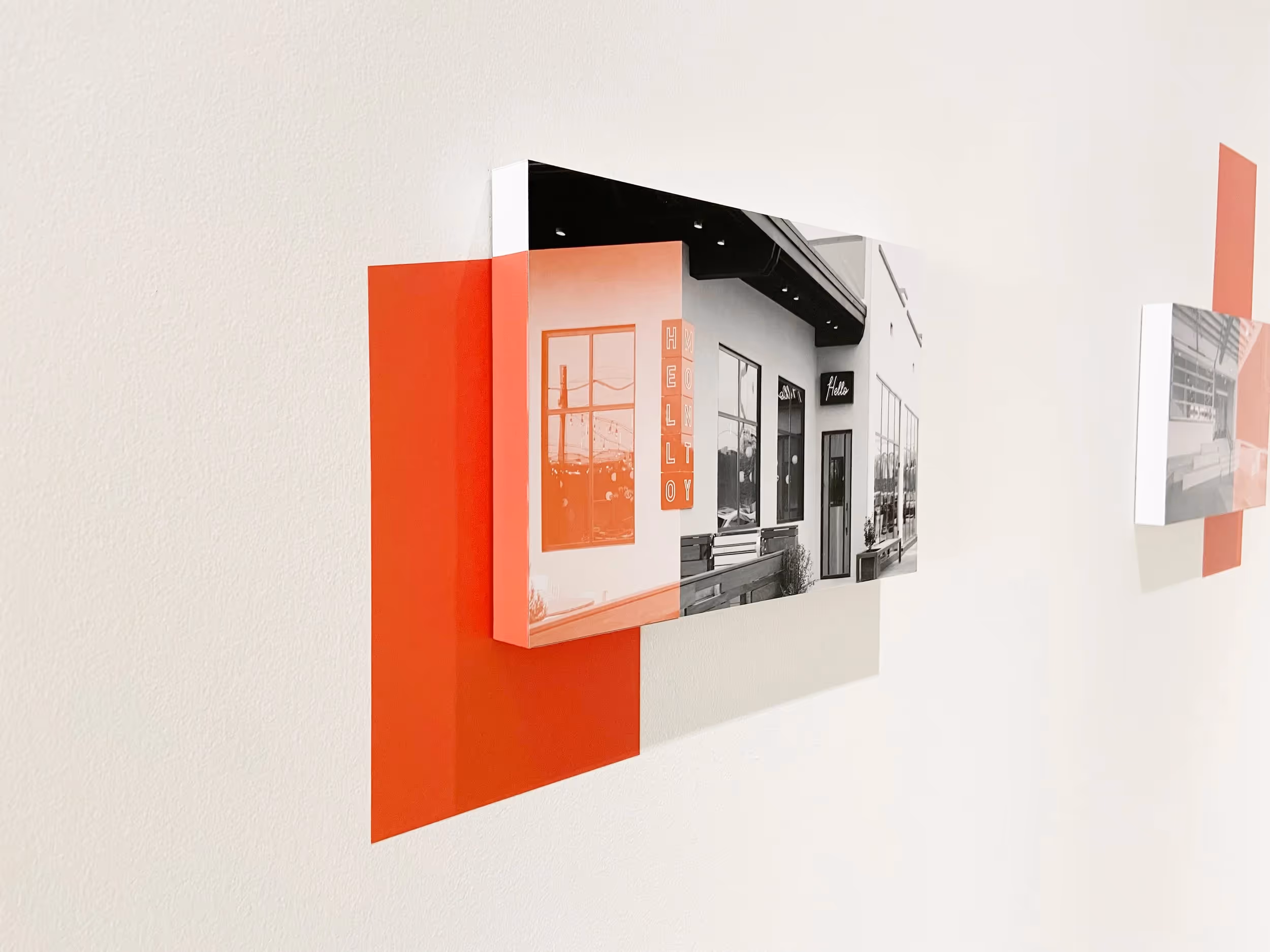 Tucker Build is a commercial construction team specializing in design-build projects, breaking the mold for each unique client challenge. Whiteboard expanded on the Tucker Build identity we created by designing environmental graphics for their new office space. Architect Hugh Newell Jacobsen designed the office with clean, Modernist minimalism, which our team embraced and enhanced through strategic environmental graphics. The office features standoff black and white photographs of Tucker Build's work, dynamically accented with bright swatches of red and orange that break edges and spill across walls. This approach creates visual energy while maintaining restraint that unifies the space across hallways and rooms, perfectly reflecting Tucker Build's philosophy of thoughtful, bespoke construction solutions.
