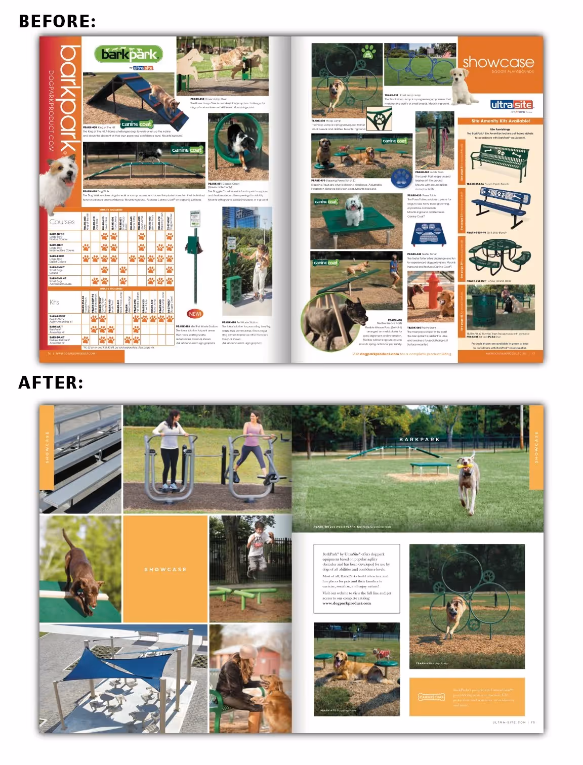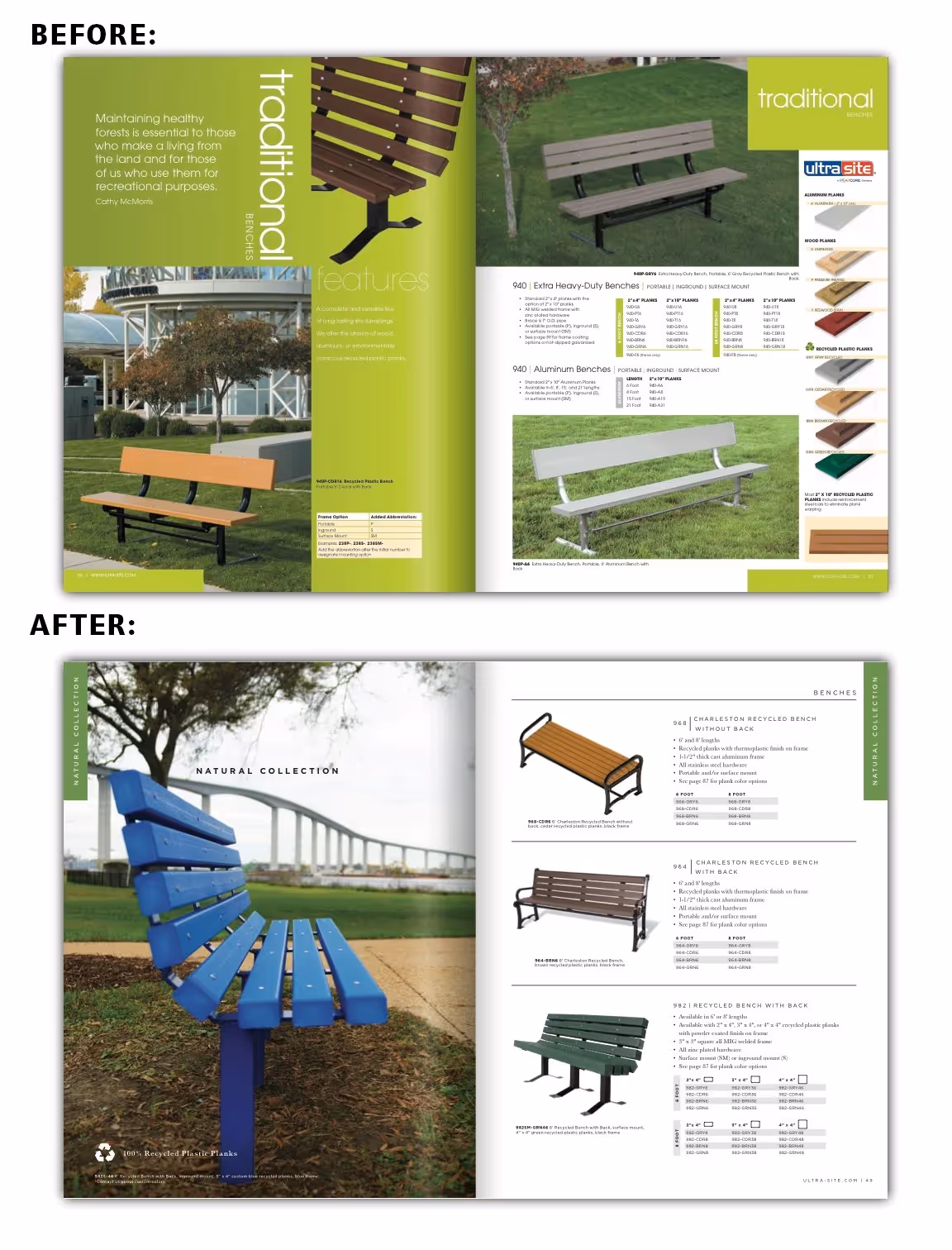 UltraSite, a PlayCore Company specializing in high-quality commercial grade outdoor recreation products, recognized that their existing catalog design wasn't effectively communicating their brand excellence. Despite strong product quality, customer service reputation, and industry equity, leadership felt their catalog presentation was falling short of their standards. Whiteboard collaborated with UltraSite's leadership team, including Stephanie Devine and Mimi Marler, to develop a catalog design that would properly showcase their comprehensive product line including site furnishings, park amenities, picnic tables, and park benches. Design Director Mandy Meredith led the creative team alongside designers Amy Harmon and Laura Michael to craft a clean, elegant solution that highlighted both superior products and professional photography by Dotson Commercial. The result exceeded expectations, with both salespeople and customers praising the clarity, style, and professional presentation of the new catalog.