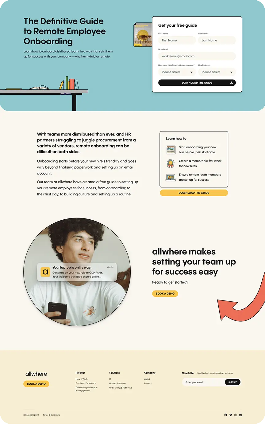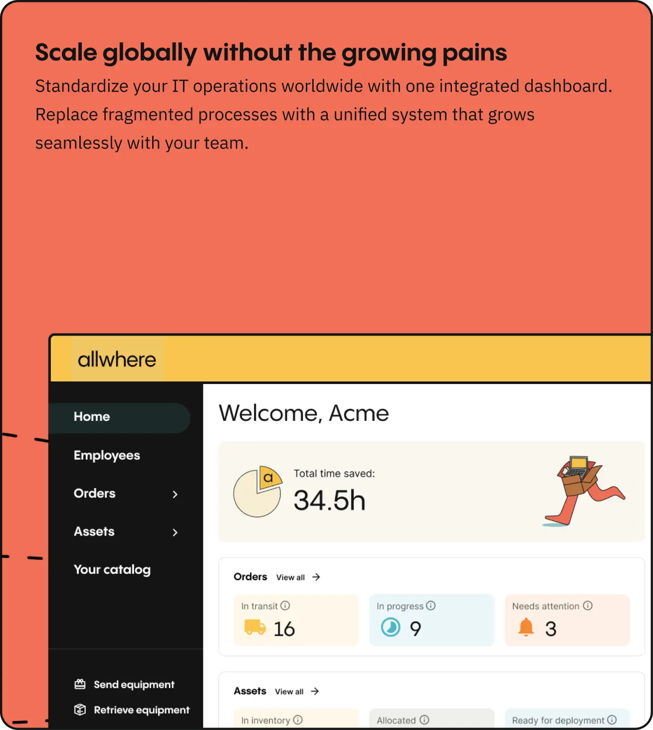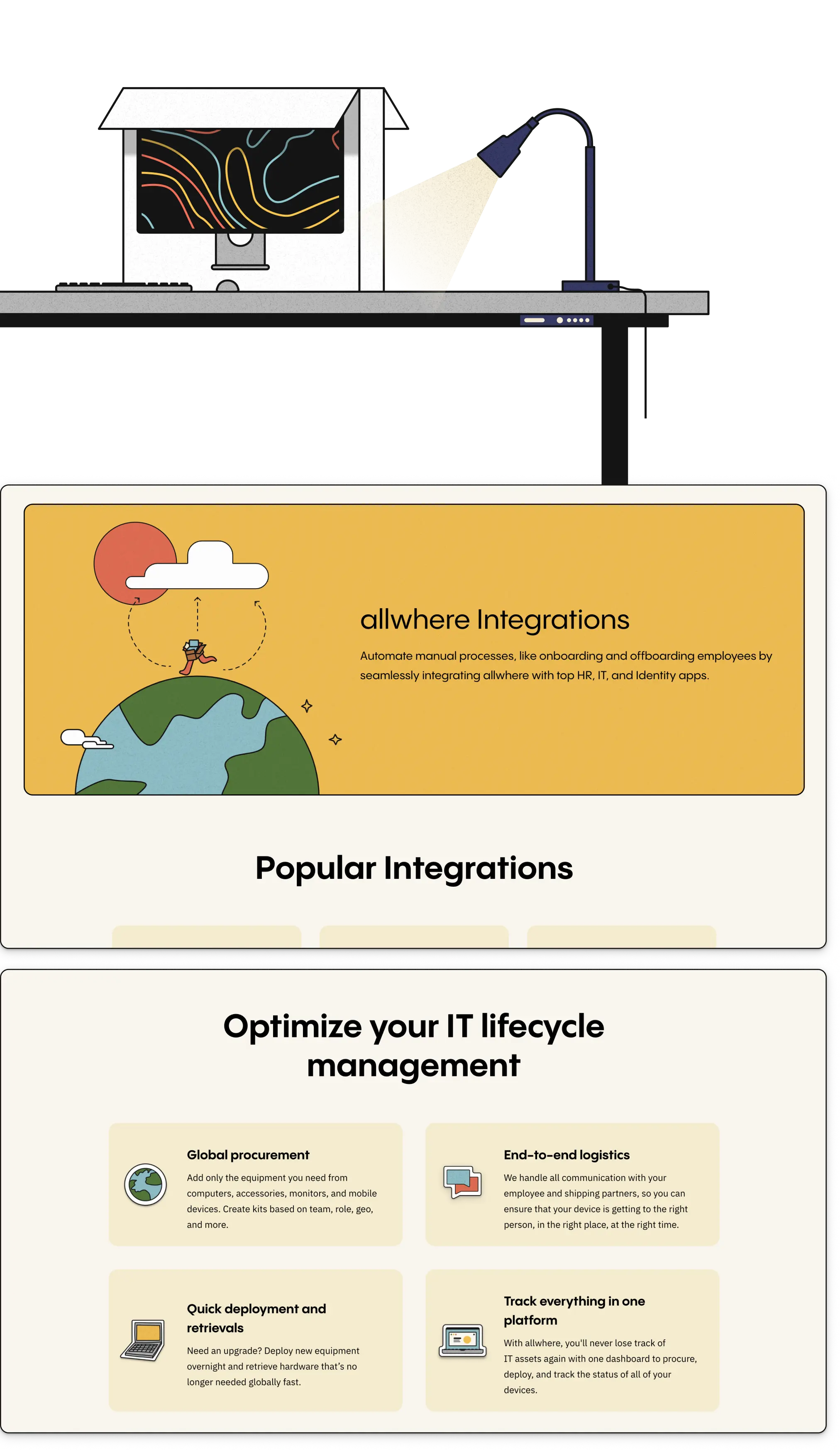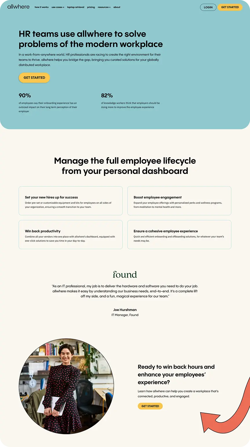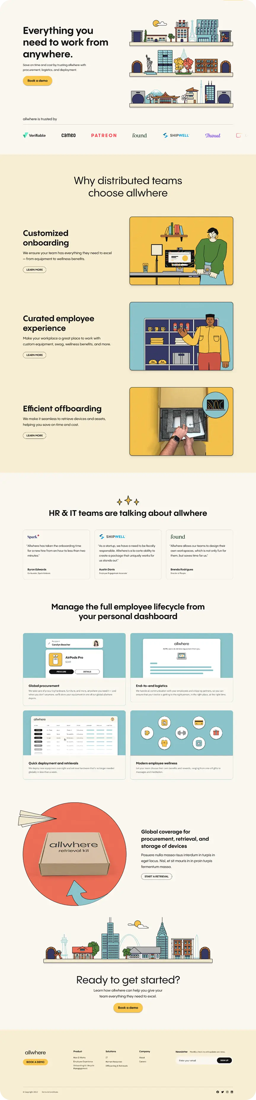 Allwhere exists to make it easy for distributed companies to care for their people well. They streamline the IT asset lifecycle—handling procurement, onboarding, retrievals, and more—so companies can stay focused on what matters most. But as they grew from early-stage startup to scaling SaaS platform, their web presence couldn’t keep up. Their existing site didn’t reflect their full value or resonate with their evolving audience of IT and operations leaders. That’s where we came in.