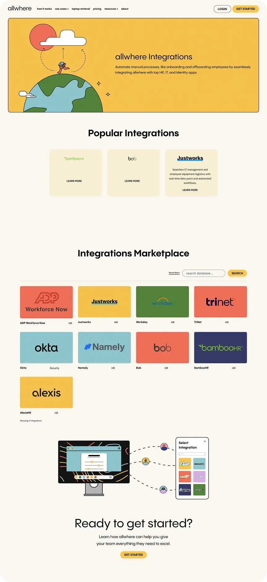 Allwhere entered our partnership with a brand system already in place—bold typography, a fresh color palette, and a distinctive illustration style. Our role was to translate and extend those brand elements into a digital experience that felt cohesive and purposeful. We helped standardize the type system, streamline the color hierarchy, and apply the illustration system in more expressive, strategic ways. One of the biggest wins was taking an illustrated shipping box and turning it into a playful mascot—adding warmth and personality across the site.